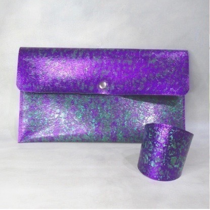 Sobres con diseño contemparáneo realizada en tela engomada o pvc sublimado en paleta de violetas y verdes, acompañados de pulseras haciendo juego.